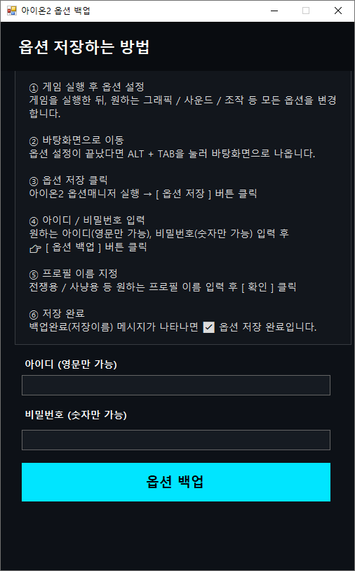 아이온2 게임은 실행시 옵션이 저장이 되지 않는게임입니다.